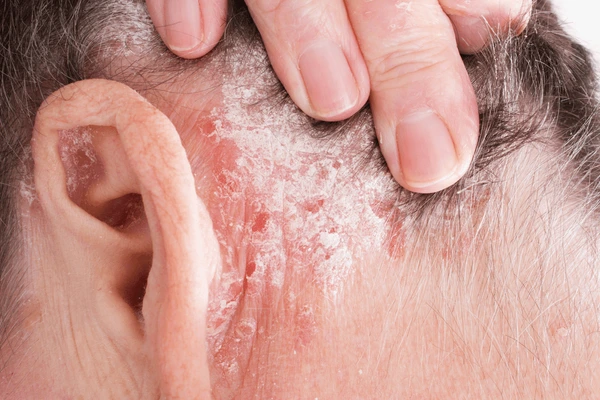 The symptoms of psoriasis vary from person to person depending on the type of psoriasis you have. The most common symptoms of psoriasis are red irritated patches of skin, usually on the knees and elbows, but can develop anywhere. Your skin is frequently dry and itchy with patches of red raised areas. Sometimes there can be changes in your nails, they can turn a yellow-brown color and thicken.