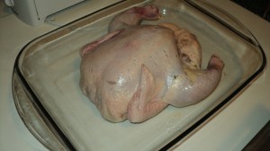 Bake for 45 minutes to 1 hour.  You can check for doneness by checking the color of the skin which should be a medium shinny brown color.  You can also check by taking the mold out of the oven and very carefully with a large fork try to pull the legs of the chicken.  If the legs easily come off then the chicken is probably ready.