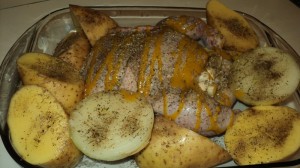 • Lightly drizzle the olive oil over the chicken and veggies then drizzle only the chicken with the sugar and mustard.