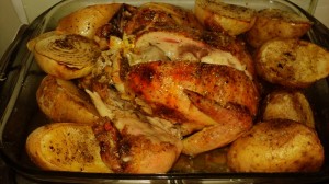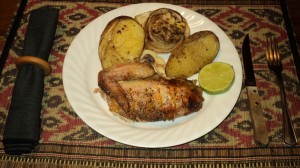 Add to each plate a quarter of the chicken with some potato, onion and half of the garlic bulb.  Drizzle some of the juices from the mold and serve.