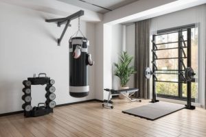 Home Gym With Barbell, Dumbbells, Boxing Bag And Other Sports Equipments