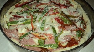 Now add your toppings starting with the mixed cheeses, enough to comfortably cover the entire sauce covered surface.
