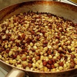 Heat extra large frying pan to high. Once the pan is hot add the peanuts and for the next 35 minutes mix occasionally careful to occasionally check that you do not over roast as it will give the peanuts a bitter flavor. To check doneness remove a few peanuts after the allotted time and place on cutting board until it cools off then take a bite to see if the peanuts have that “cracking” sound and feel.