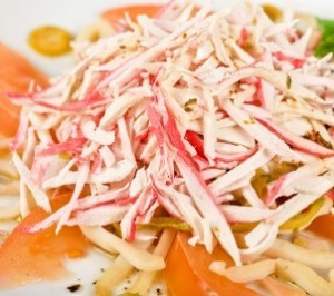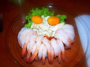 After 3 minutes in a medium size bowl add the crab meats to fill ¾ s of the bowl followed by the cocktail sauce then add the shrimp to the lip of the bowl to fill it halfway you should be able to get around 18 on the lip add the kumquats to the presentation and bon appetite.